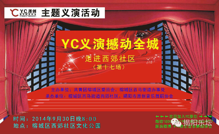 YC义演撼动全城第17场走进榕城西郊社区2014年09月30日揭阳乐坛演出动态#YC义演撼动全城#2014年9月30日YC义演撼动全城第17场走进榕城西郊社区,这里是揭阳古八景之一的钓鳌仙迹,诚邀大家到时前来赏YC,品仙迹上一篇:揭阳一中首部悬疑穿越电影《十年TENYEARS》下一篇:YC义演撼动全城第18场将于10月1号走进嘉盛华府00